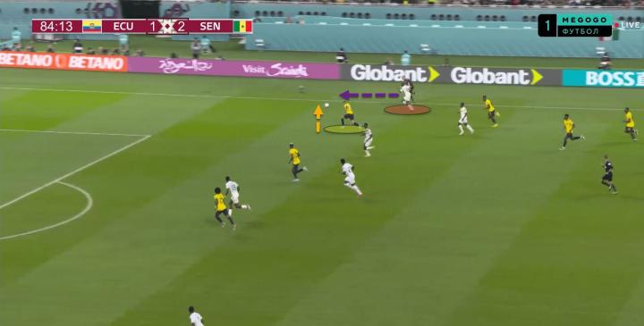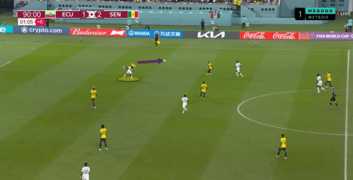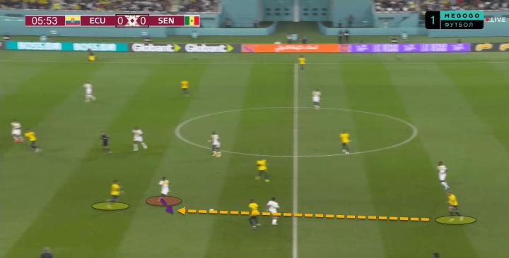上图中,厄瓜多尔在中场线附近轻松建立了控球权,并寻找突破塞内加尔防线的机会。