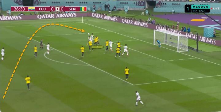 上图中,球被送到了厄瓜多尔左后卫的身后,因卡皮耶是距离进攻球员最近的中后卫,因此必须到边路进行防守。