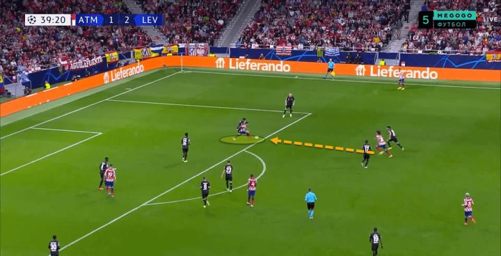 上图中有一个极佳的例子,因卡皮耶紧紧地防守着他的盯防对象。也许逼得有点太紧了,尽管他成功地将球从马竞前锋的脚下拨开,他的防守非常出色。