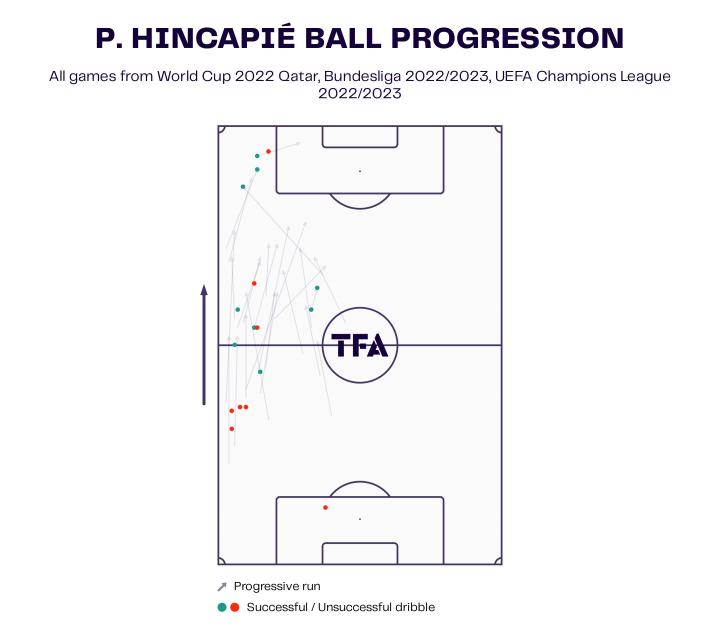 正如我们在上面看到的因卡皮耶在俱乐部和国家队的带球推进图。他擅长盘带,能够在压迫下冲刺,将对手的后防线压得更深。