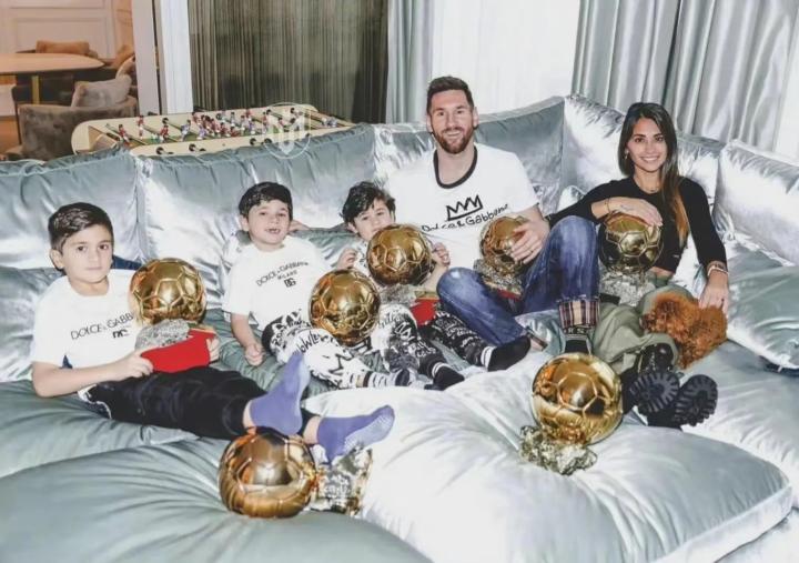 (图)梅西和家人与七座金球合影