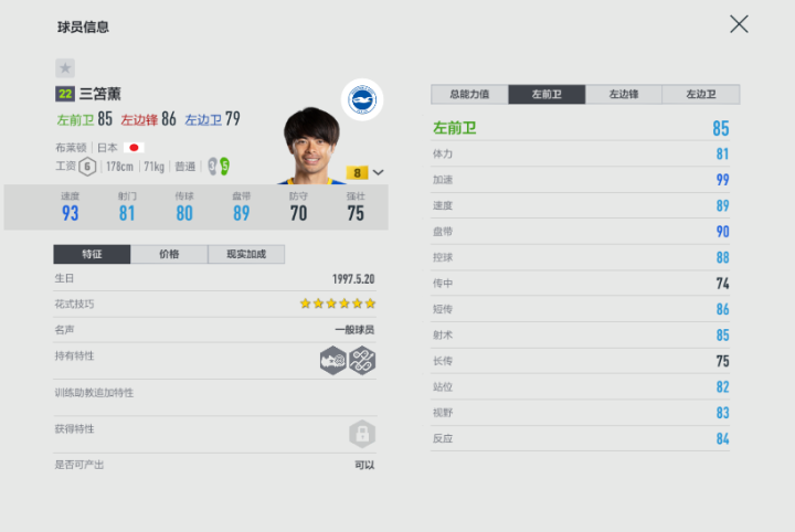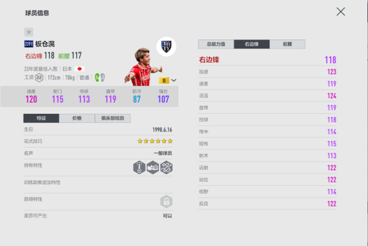 当然,如果将来要推出赛季卡的话,他的数值很可能要比堂安律还要突出,尤其是盘带、控球和双速,甚至可以期待达到135左右的数值。