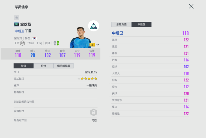 从现实表现来看,金玟哉依旧有很大的潜力,他的身体对抗能力极强,回追速度快,这两点在游戏里的WC22、SPL等赛季卡中也得到了体现,强壮和双速均在130数值以上,再结合190cm的身高,其实已经有一线中卫的模板了。