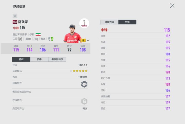 游戏里的阿兹蒙主要就是这张WC22赛季卡,可以看到破130数值的射术、头球和弹跳都是他现实中的强项,因此在游戏里的终结能力也同样顶级。