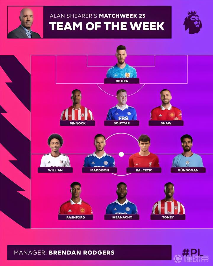 英格兰的传奇射手阿兰-希勒挑选出了自己心目中英超第23轮的最佳阵容,曼联的三名球员德赫亚、卢克-肖以及拉什福德入选,此外阵容中还包括了京多安以及利物浦的18岁中场巴伊切蒂奇。