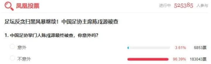 种种迹象表明,这轮中国足坛反腐调查阵仗很大,而且还没有收网。不过陈戌源出事还是让人感到惊讶(虽然凤凰民调显示95%以上的人并不感到惊讶)。基本上可以断言——陈戌源这个在国企浸淫了一辈子本可能功成名就的官员,在执掌中国足协三年半后已经晚节不保。