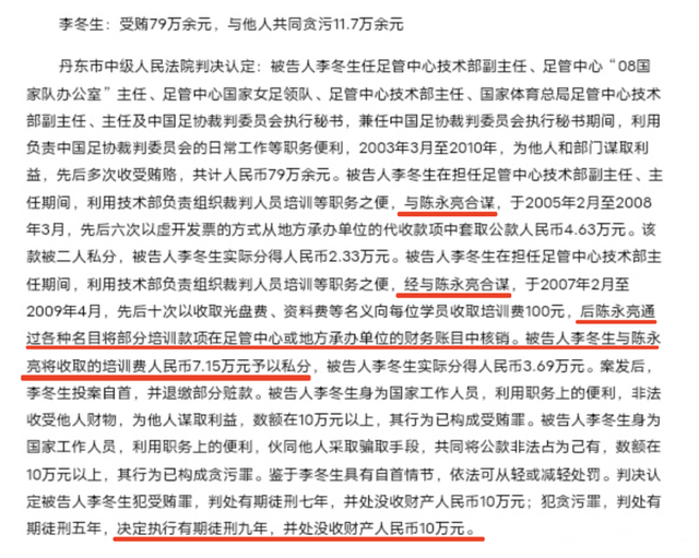 根据2012年6月13日丹东市中级人民法院发布的前足管中心技术部主任的宣判书,李冬生在担任足管中心技术部副主任、主任期间,利用技术部负责组织裁判人员培训等职务之便,与陈永亮合谋通过裁判培训费来分赃培训款项。