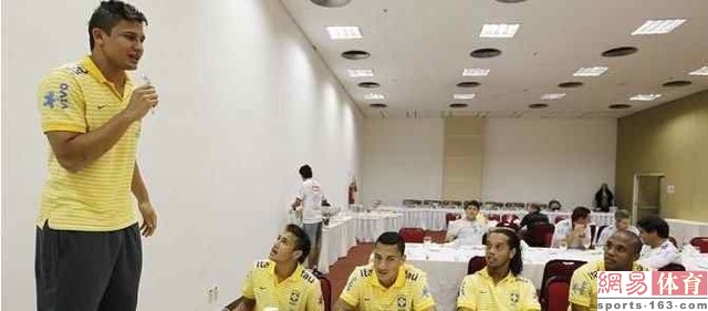 按照惯例,每一名球员都需要在赛前的晚餐宣读集训心得。尽管准备了2天,但是面对在座的各路球星,埃尔克森举勺子(模拟话筒)的手仍然紧张得发抖:“大家好,那我就简单地讲两句吧……”话音未落,前排的内马尔就让他唱两句,埃尔克森只好乖乖地唱了一首帕拉之歌。当歌声响起,所有人都跟着节奏摇摆身体,气氛相当融洽。