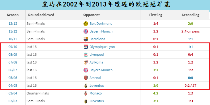 皇马在六年的欧冠十六郎时期分别在1/8决赛中被来自其余四大联赛的拜仁、阿森纳、罗马、里昂、利物浦和尤文图斯所击败。