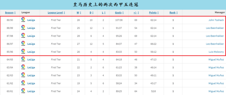 皇马在85/86赛季到89/90赛季期间以五连冠的成绩称霸西甲联赛,这也是皇马历史上第二次联赛五连冠。皇马在1960年到1965年也曾创造过联赛五连冠伟业。皇马在五连冠之后遭遇了西甲的四年冠军荒,也同时缺席了4个赛季的欧冠联赛。
