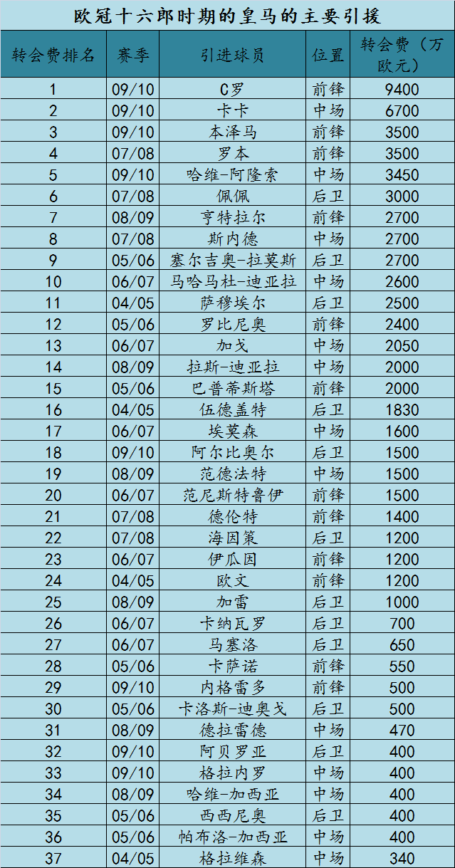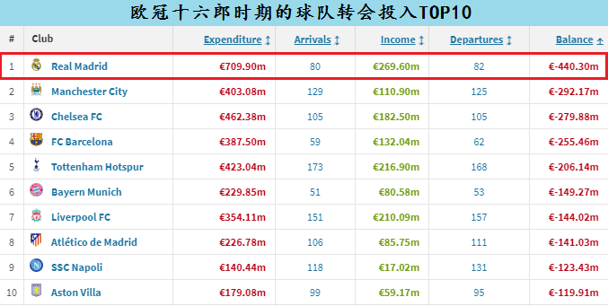 皇马在欧冠十六郎时期(04/05赛季到09/10赛季)的转会投入高达7.099亿欧元,远远超过了同时期的曼城、巴塞罗那、切尔西等同样在该时期挥金如土的超级豪门。