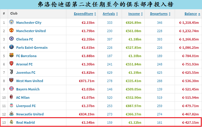 皇马在此期间共计的转会支出约15.4亿欧元,转会净投入仅为4.27亿欧元,皇马的转会净投入仅位列同期世界足坛的第13位。有意思的是,皇马在此期间的转会净投入仅比老佛爷的首次任期多出了约7000万欧元。
