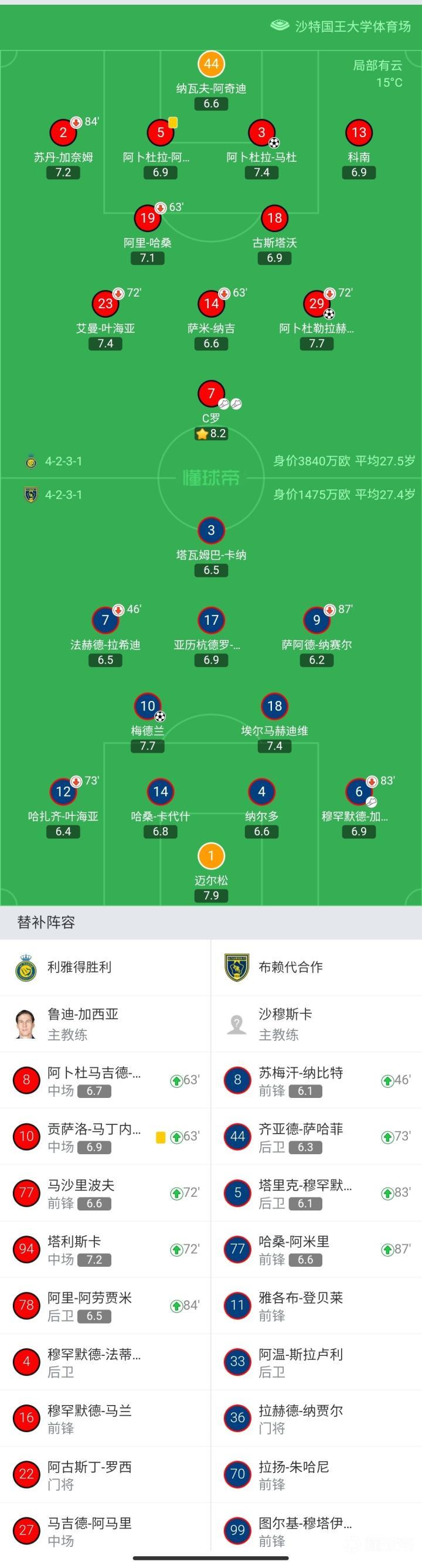 利雅得胜利首发:44-纳瓦夫-阿奇迪、2-苏丹-加奈姆(84′78-阿里-阿劳贾米)、3-阿卜杜拉-马杜、5-阿卜杜拉-阿姆里、13-科南、19-阿里-哈桑(63′10-贡萨洛-马丁内斯)、18-古斯塔沃、29-阿卜杜勒拉赫曼-加里卜(72′94-塔利斯卡)、23-艾曼-叶海亚(72′77-马沙里波夫)、14-萨米-纳吉(63′8-阿卜杜马吉德-苏莱西姆)、7-C罗