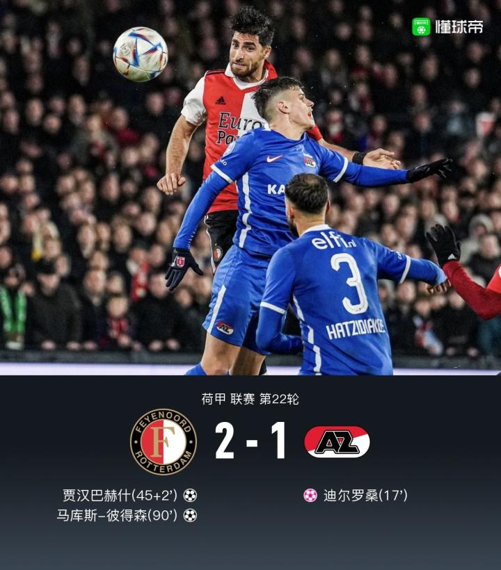 北京时间2月19日04:00,荷甲第22轮迎来榜首大战,费耶诺德坐镇主场费耶诺德球场迎战阿尔克马尔,本场主裁判为希赫莱尔。上半场,迪尔罗桑自摆乌龙,贾汉巴赫什泰山压顶头槌扳平比分。下半场,马库斯-彼得森无解世界波绝杀。最终,费耶诺德主场2-1逆转阿尔克马尔。