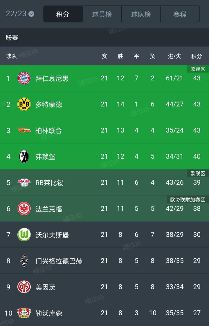 大伙儿都有戏?德甲21轮过后前三名同积43分