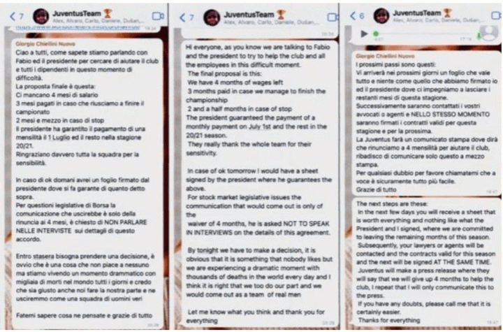 在Whatsapp里,基耶利尼发布了一条信息,概述了协议的结构,并告诉队友们“不要在采访时多话”,因为股市是有监管的。球员们放弃了一个月的薪水,并得到了保证,即便在此期间离开俱乐部,也能得到剩下三个月的薪水。