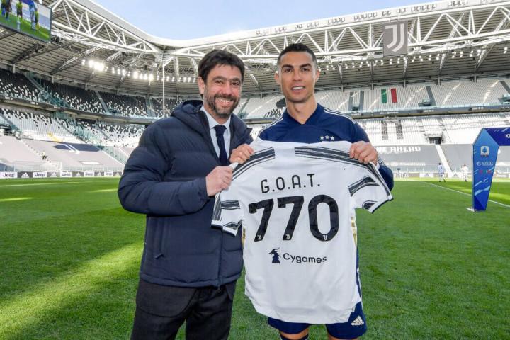 (图)阿涅利和C罗在2021年庆祝后者俱乐部第770球