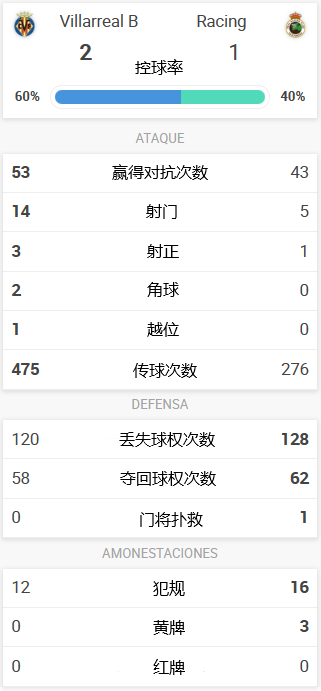 最终全场比赛结束,比利亚雷亚尔B队在先丢一球的不利情况下后来居上拿到了宝贵的三分,本赛季都以绝杀的方式实现了对桑坦德竞技的双杀。