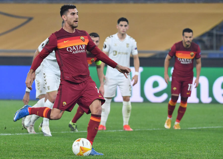 2020/21赛季欧联1/16决赛次回合,罗马3:1主场力克布拉加。图为洛伦佐·佩莱格里尼主罚点球。