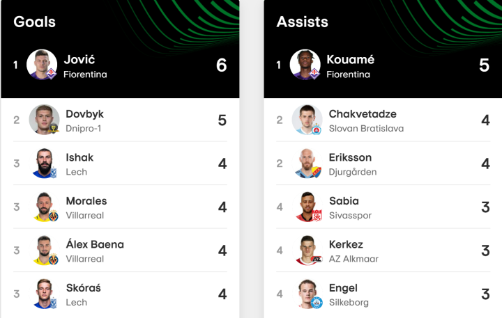 佛罗伦萨的约维奇目前以6粒进球领跑欧协射手榜,而其锋线搭档夸梅则是以5次助攻领跑助攻榜。佛罗伦萨目前以18粒进球成为本赛季欧协进球最多的球队。