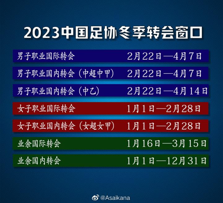 ======2023转会期主要信息清单,长期置顶,私信前必看====== 【冬季转会窗口(注册期)时间】 国际窗:2月22日—4月7日 国内窗(中超、中甲):2月22日—4月7日 国内窗(中乙):2月22日—4月14日 【夏季转会窗口(注册期)时间】(暂定) 国际窗:7月1日—7月31日 国内窗:7月1日—7月31日 注: