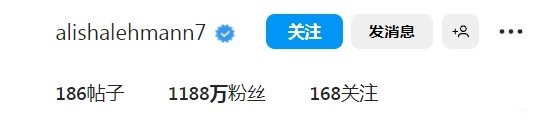 目前,艾丽莎-莱曼在社交媒体里的粉丝数为1188万,网坛名将费德勒的粉丝数是1133万,英格兰球星格拉利什的粉丝数是588万。