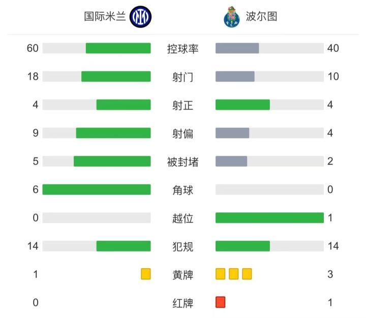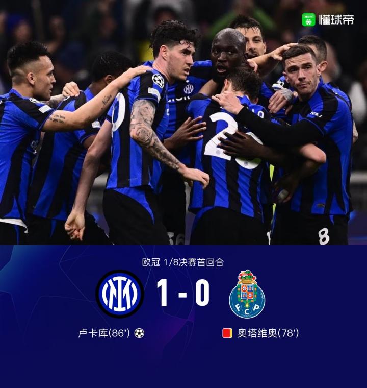 北京时间2月23日4:00,欧冠1/8决赛首回合,国际米兰主场对阵波尔图。上半场,劳塔罗头球攻门顶偏,恰尔汗奥卢兜射被门将扑出,格鲁伊奇远射打高。下半场,巴雷拉抽射偏出球门,奥纳纳多次救险,奥塔维奥累计两黄被罚下,卢卡库替补登场破门,最终,国米1-0波尔图。