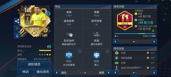 ○ 9格的耐力值配置则让卡塞米罗实战中的续航能力大大提升,可以长时间保持稳定发挥。