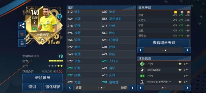 * 在没有天赋加成的数据中,卡塞米罗的远射、反应、力量、滑铲等数据也都在600以上,整体数据强度比较高。