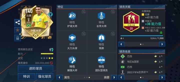 ○ 特性方面,卡塞米罗配备有大力任意球、铁人、铲球大师、长传大师、大力头球、铁肺、解围大师、团队型球员八项特性。喜欢中场球员持球打法的玩家可以考虑吧大力任意球特性更换为天赋异禀或盘带大师,提升卡塞米罗持球手感。