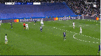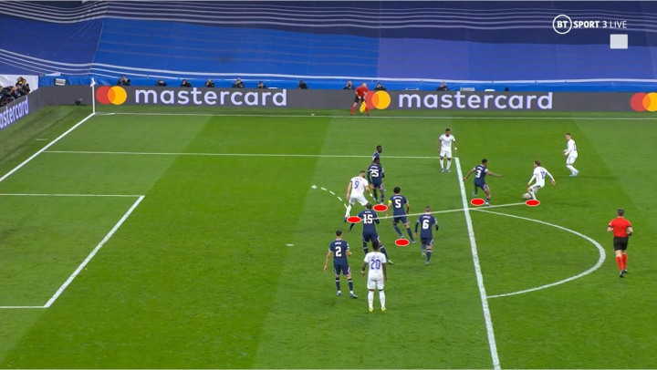 这次莫德里奇接应维尼修斯的回传球后,在肋部控球,找到了唯一一条传球给本泽马的线路。穿裆金彭贝后,找到在马尔基尼奥斯和努诺门德斯之间空档的本泽马。本泽马晃开角度,打门得手,扳平比分。