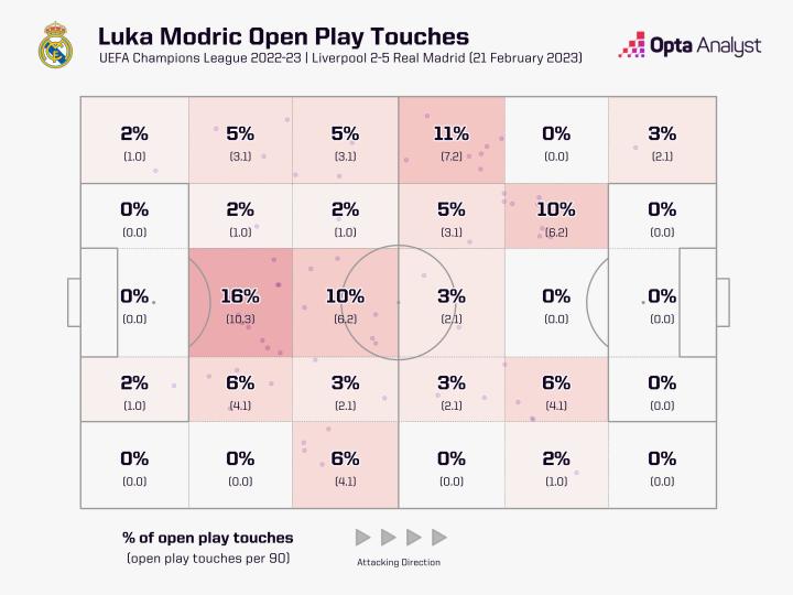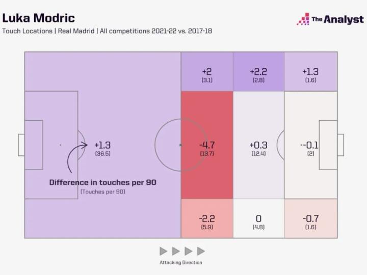 相较于三连冠时期,莫德里奇在上赛季的位置更加靠后,更加偏向左路。在后场的触球次数场均多了1.3次,在左路的触球次数场均多了5.5次(这一侧有维尼修斯这个重要爆点)。