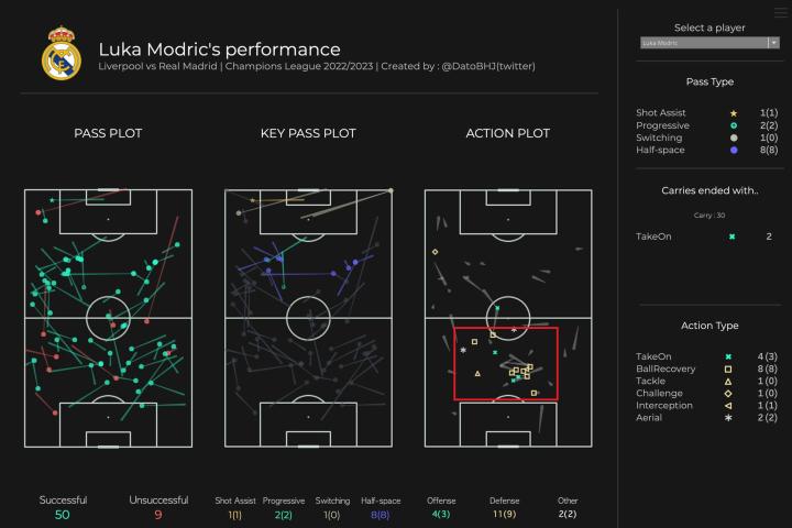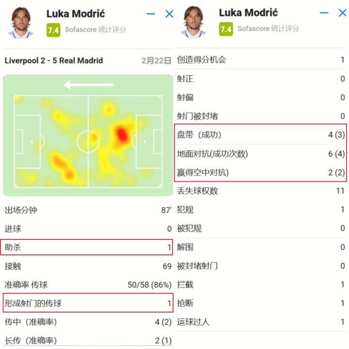 全场贡献1次助攻,完成4次传中,4次带球成功3次,8次一对一对抗赢下6次。可以说年老的莫德里奇,也完胜了本场利物浦的中场。尽管在防守端只有1次拦截和1次抢断,但是莫德里奇为球队防守所做的工作不仅仅是数据可以反映的。