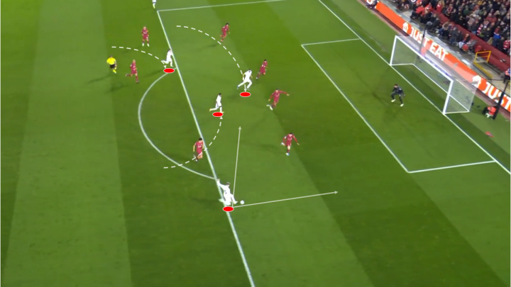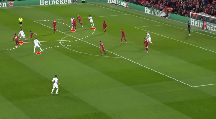 这次维尼修斯和罗德里戈两人都来到左路带走了四名防守人,利物浦的中路是很空的。只是莫德里奇第一下没有想到罗德里戈会脚后跟做球,不过随后他的反应很快,跟进很及时。如果这次传球没碰到对方,巴尔韦德可以在禁区弧顶拿球直接来一脚远射。