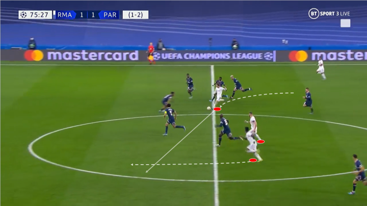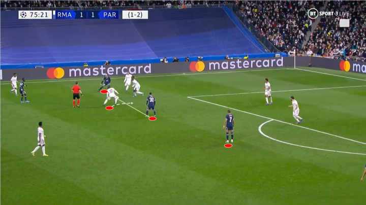 随后莫德里奇摆脱了回追的内马尔和干扰的另一名巴黎球员,面对金彭贝的上抢,莫德里奇很快直塞给了维尼修斯。同时自己和中路的本泽马继续跟进。