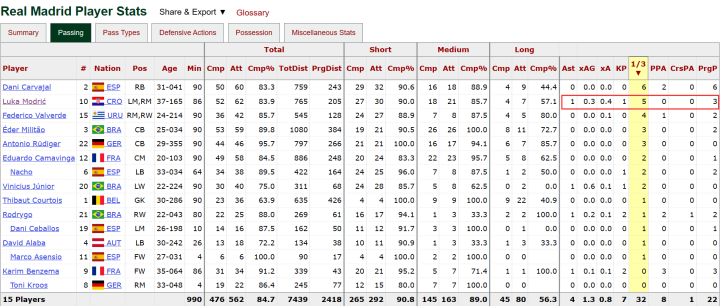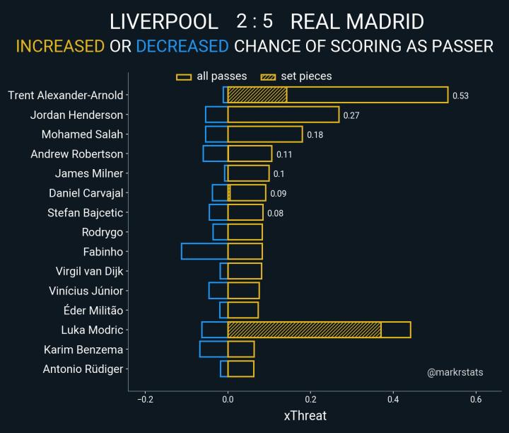 创造机会的传球手中,莫德里奇在两队所有球员里,仅次于利物浦的阿诺德一点,是皇马全队本项数据最好的存在。
