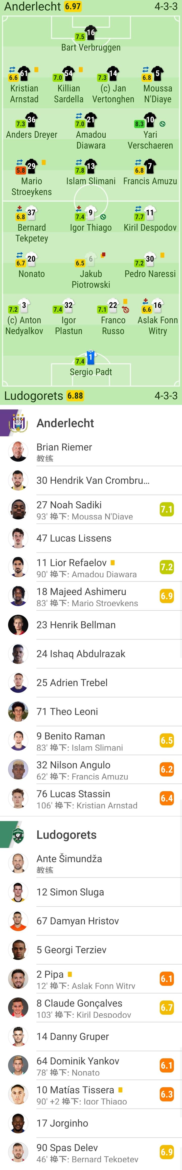 安德莱赫特首发:16-韦布吕让、54-萨尔代拉、14-维尔通亨、5-穆萨-恩迪亚耶(93'27-萨迪基)、36-德雷尔、61-阿恩斯塔(106'76-斯塔辛)、21-阿马杜-迪亚瓦拉(90'11-里奥-拉斐洛夫)、10-费尔沙伦、29-斯特罗伊肯斯(83'18-阿希梅鲁)、13-斯利马尼(83'9-拉曼)、7-阿穆祖(62'32-尼尔松-安古洛)