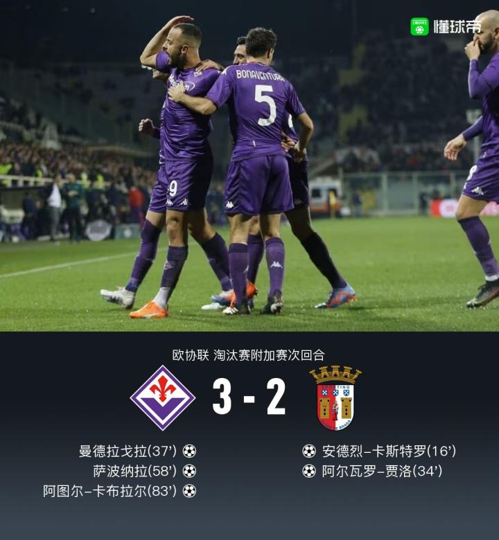 佛罗伦萨3-2逆转布拉加,总分7-2晋级,博纳文图拉助攻戴帽