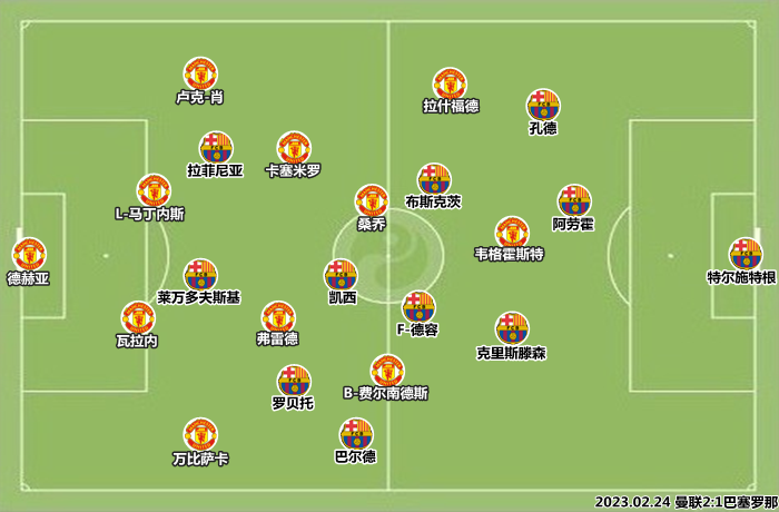 在上周末的联赛中,利桑德罗-马丁内斯和萨比策已经复出,滕哈格改变了首回合时的防守架构,卢克-肖回到左后卫位置,弗雷德依然保有主帅的信任。考虑到布斯克茨已经复出,滕哈格将桑乔摆在中路来限制巴萨的中场传导,卡塞米罗协助卢克-肖盯防拉菲尼亚,拉什福德靠前压制孔德,哈维从改变德容的打法入手以点带面的破局。