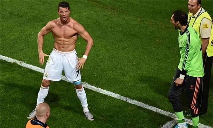 据说第一个因为脱衣庆祝吃到黄牌的球员,是我们非常熟悉的C罗。2004年欧洲杯半决赛,葡萄牙对阵荷兰,19岁的C罗进球之后不顾禁令,脱衣狂奔——那时的他还是一副干瘦的身板,满脸青春痘。十年之后的欧冠决赛,皇马对阵马竞,C罗加时赛罚进关键点球,旋即脱掉球衣,露出“魔鬼筋肉”——小麦肤色,面目狰狞,宽厚的背阔肌像翅膀一样张开。