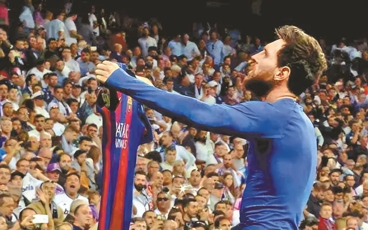 绝代双骄的另一位王者梅西,则是完全不同的画风。2017年的西班牙国家德比,2:2的比分咬至伤停补时阶段,梅西鬼魅一般出现在“倒三角”传球路线的终点,一脚轻巧的推射将皮球送进球门。这是梅西职业生涯的第500球,只见他脱下球衣跑向底线看台,在万千球迷面前晾晒10号战袍。当然了,即便是球王梅西,也不得不因为“睥睨天下”的脱衣庆祝而吃到黄牌。