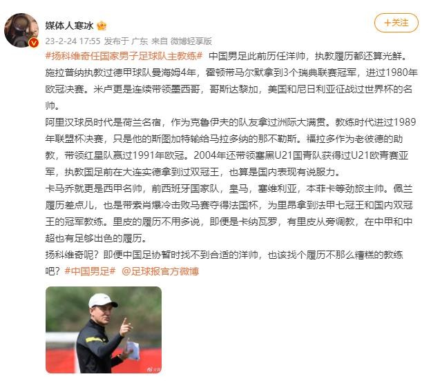 北京时间2月24日,中国足协官方宣布聘任扬科维奇为中国国家男子足球队主教练。然而,媒体人陈冰(足球报记者)在社交媒体表示,男足此前的历任洋帅,执教履历都还不错,而扬科维奇呢?国足怎样也该找个履历不那么糟糕的教练吧?