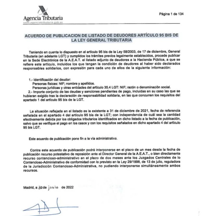 除了税务审查,财政部每年还会公布一份堪称财政生死簿的违约债务人名单(La lista de morosos del Ministerio de Hacienda),详细记录了各类社会名流对财政的欠款,每当欠款超过60万欧元就会出现在这份名单上,对许多名人而言这是极大的声望打击,甚至可能会有牵扯进刑事犯罪的可能。