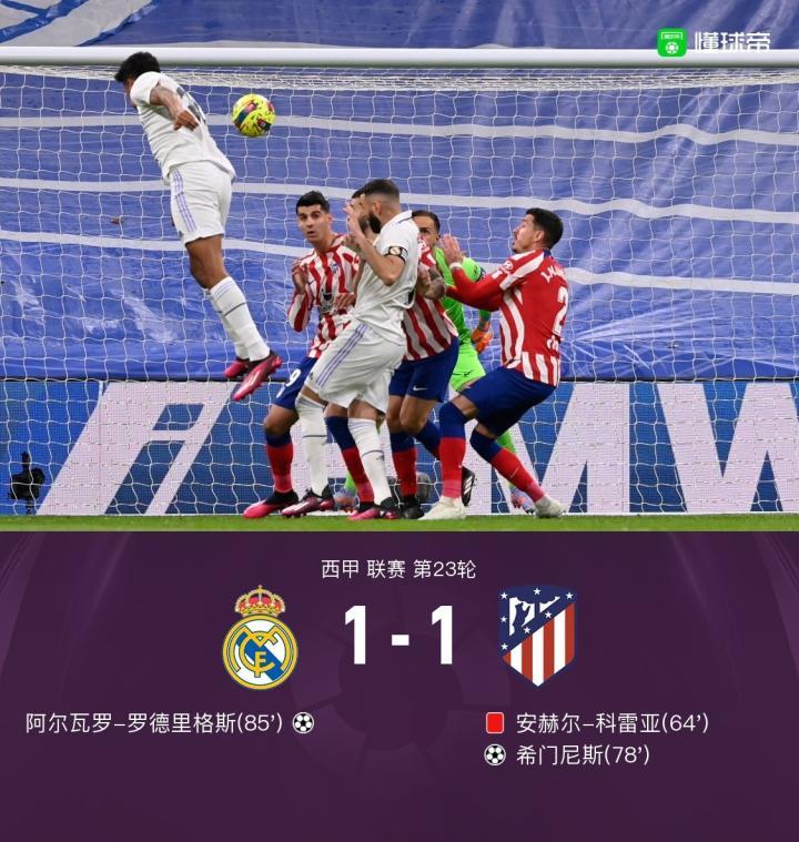 皇马1-1十人马竞,18岁小将阿尔瓦罗绝平救主,希门尼斯破门