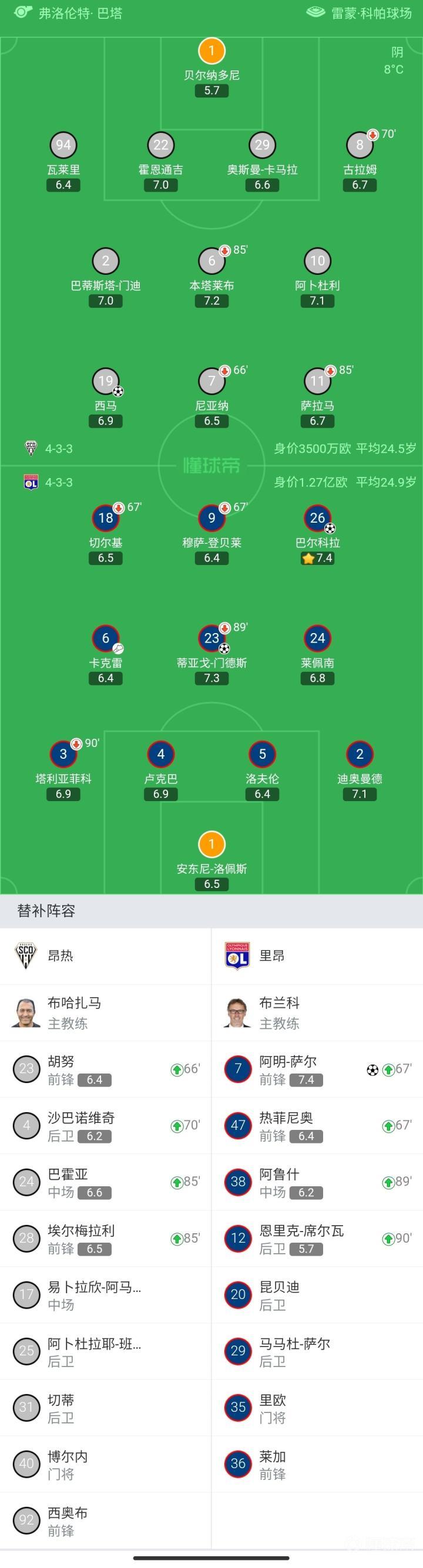 昂热首发:1-贝尔纳多尼、94-瓦莱里、22-霍恩通吉、29-卡马拉、8-古拉姆、11-萨拉马、2-巴蒂斯塔-门迪、6-本塔莱布、10-阿卜杜利、7-尼亚纳、19-西马