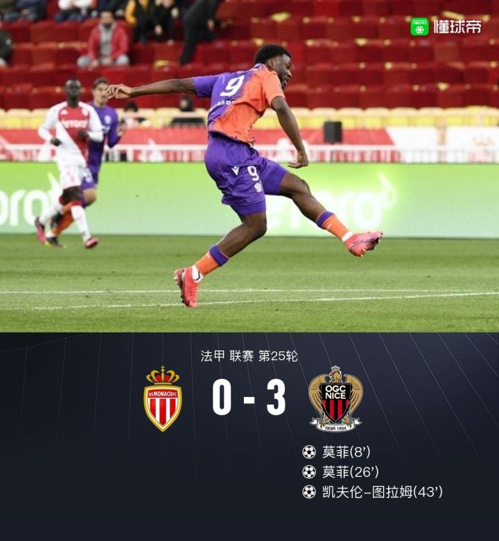 摩纳哥0-3尼斯,莫菲两射一传,凯夫伦-图拉姆传射建功