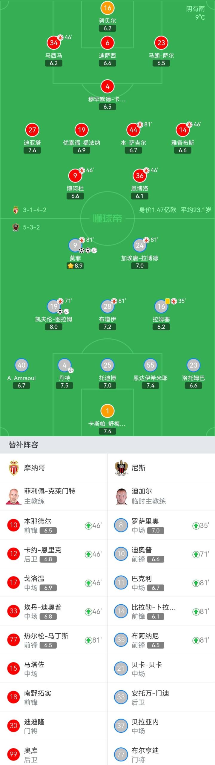 摩纳哥首发:16-努贝尔、34-马西马(46'33-埃丹-迪奥普)、6-迪萨西、23-马朗-萨尔、4-穆罕默德-卡马拉、19-优素福-福法纳、44-本-萨吉尔(81'77-热尔松-马丁斯)、27-迪亚塔、14-雅各布斯(46'12-卡约-恩里克)、9-博阿杜(46'17-戈洛温)、36-恩博洛(46'10-本耶德尔)