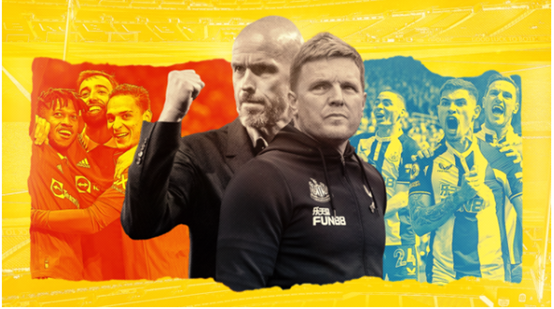 腾哈格Erik ten Hag的曼联在半决赛中以两回合总比分 5-0痛打了诺丁汉森林(doge),将这个新升入英超的老豪门扔进了淘汰的垃圾桶中。而 Eddie Howe 的纽尔斯卡联则以 3-1 总比分击败南安普顿,自 1999 年以来首次进入国内决赛。
