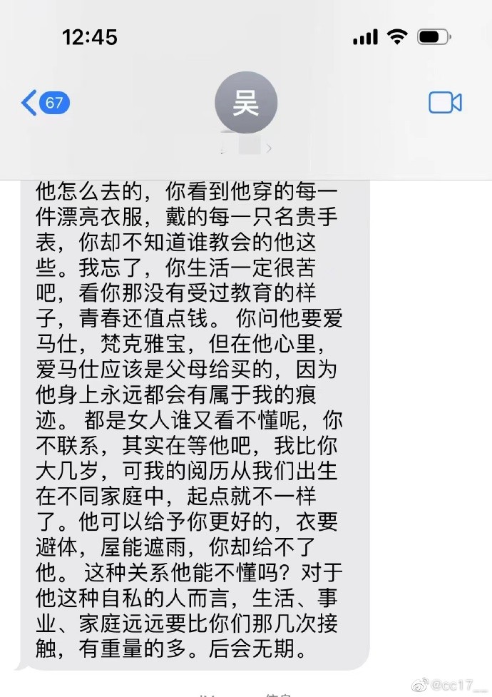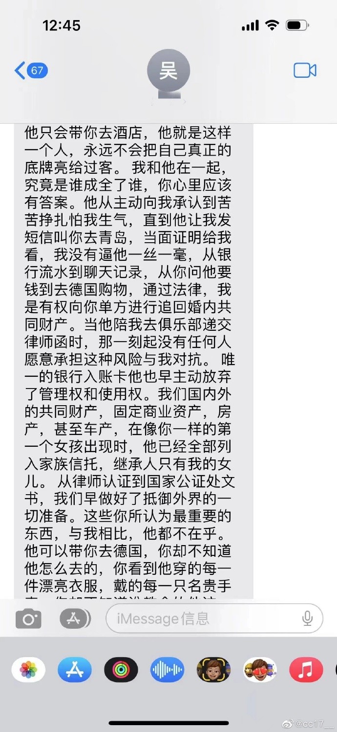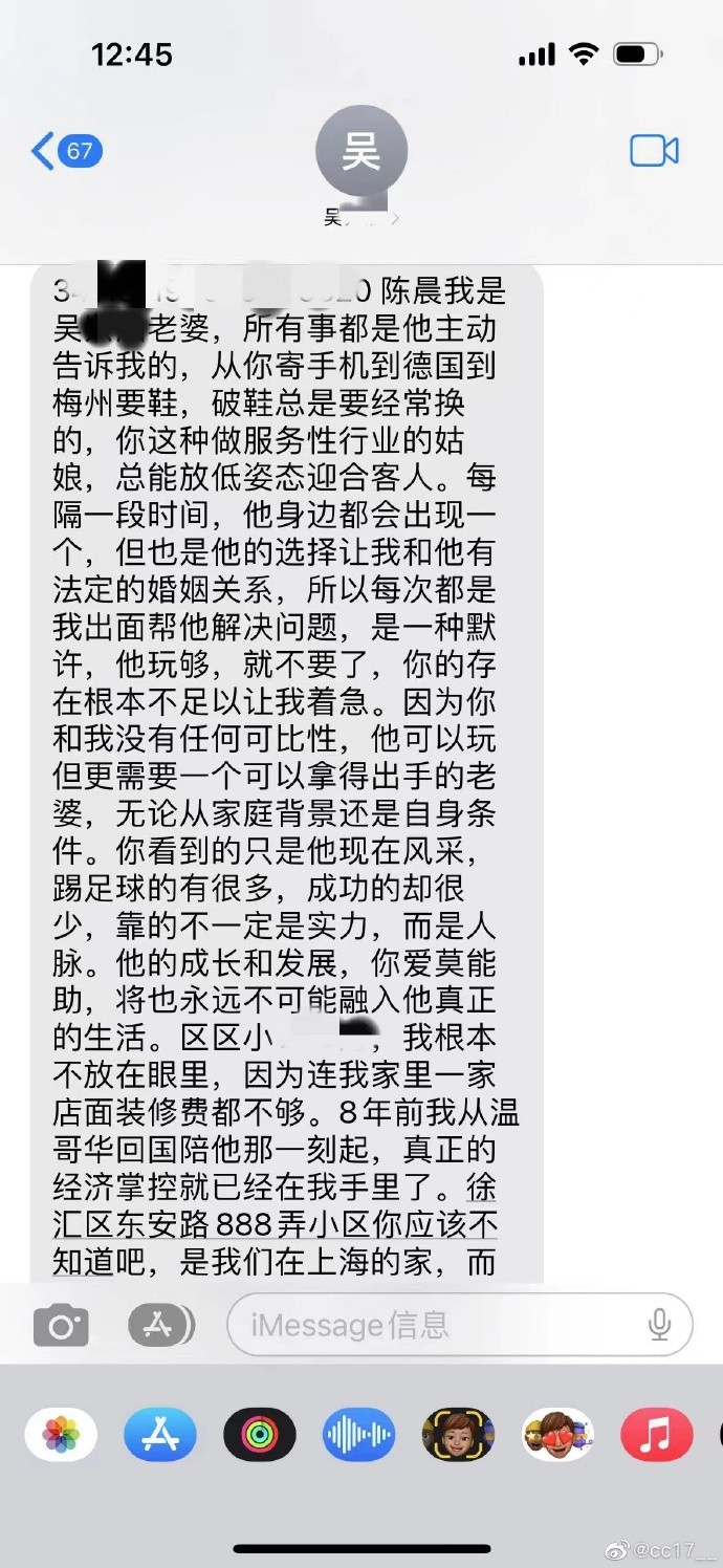 北京时间2月26日,吴兴涵“出轨门”事件女主陈晨在个人微博上展示疑似吴兴涵老婆给自己发的短信。