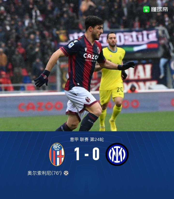 第76分钟,国米后场失误,奥尔索利尼劲射建功,博洛尼亚1-0国际米兰。